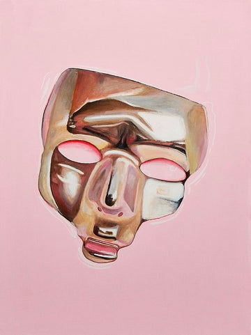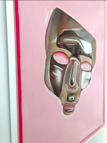 Preisz uses traditional oil painting techniques to detail the reflective surface of a mysterious mask as it sinks into an opaque musk-stick hued background. In a contemporary twist all four edges of the canvas are painted in the most intense cerise achieving a glowing pink halo. A tongue-in cheek reference to the colour war between artists Kappor and Semple.