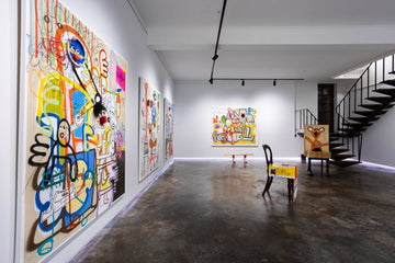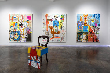 The works on display ranged from mattress-sized mixed-media canvases to installation works consisting of chairs and skateboards wearing converse shoes. Peppered throughout each were indexical traces of life, of Murugavell’s everyday — but as viewers, you are also given the chance to find traces of your own everyday within the artworks.
