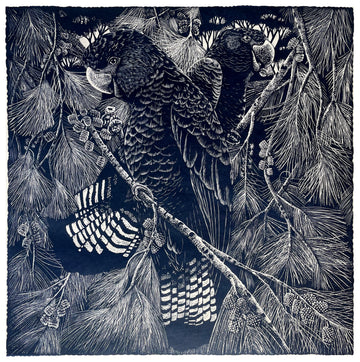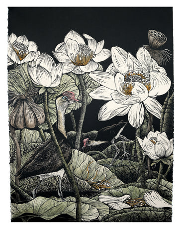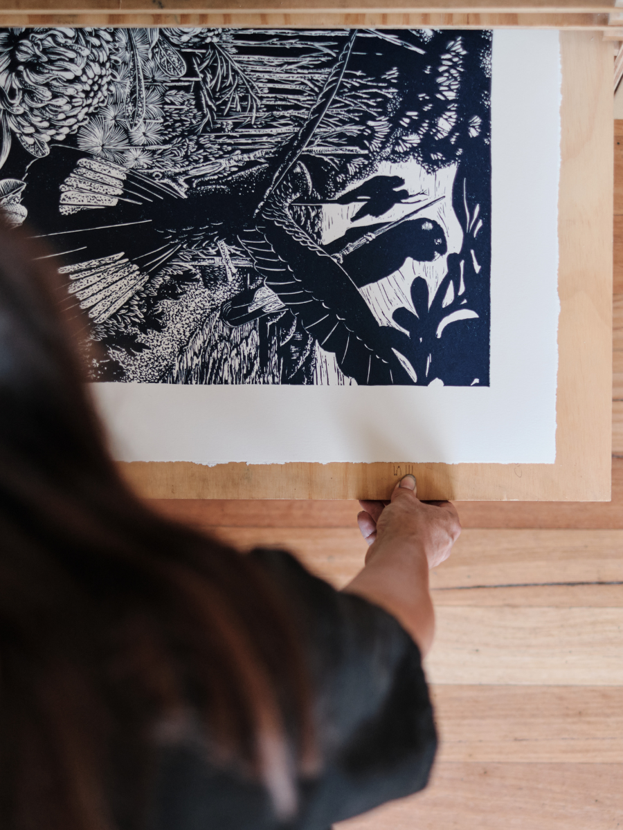 Once carving begins, depending on the scale, a single work can take anywhere from 60 to 230 hours to complete. When the carving is finished, I run a series of test prints, refining areas until I’m satisfied with how the image translates to paper. Only then do I print and edition the final work.