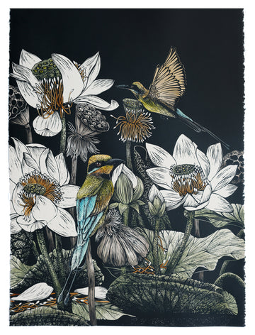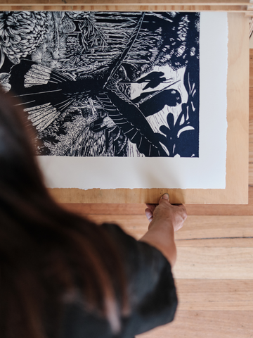 I usually draw directly onto the lino in a loose, gestural way, refining the image as I carve. This approach brings a spontaneity that I wouldn’t achieve if I drew everything on paper first and transferred it across.