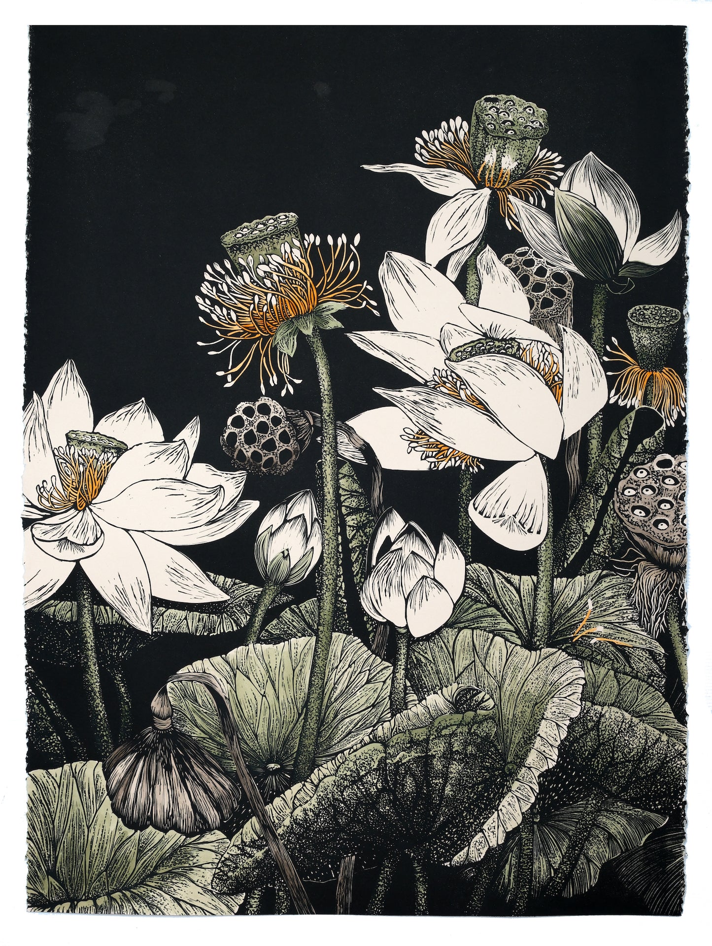 I love detail...I love trying to translate form and texture into marks, finding ways to make marks that looks like a flower with shape and form, with light and shadow is so interesting and challenging for me. Making objects feel 3D within lino prints is part of my thoughts when craving the lino.