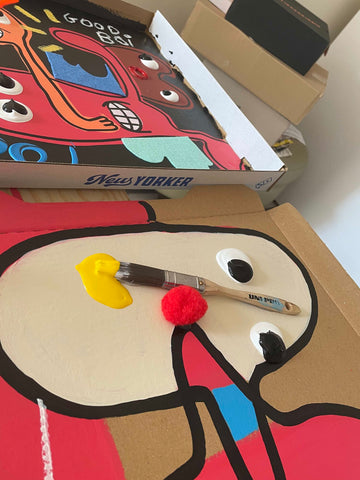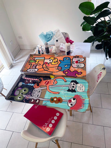 I sat down to chat with Joi about her latest release of Pizza box paintings. The 2020 boxes proved so popular, selling out across Australia and Asia, she is now venturing into Jumbo size.