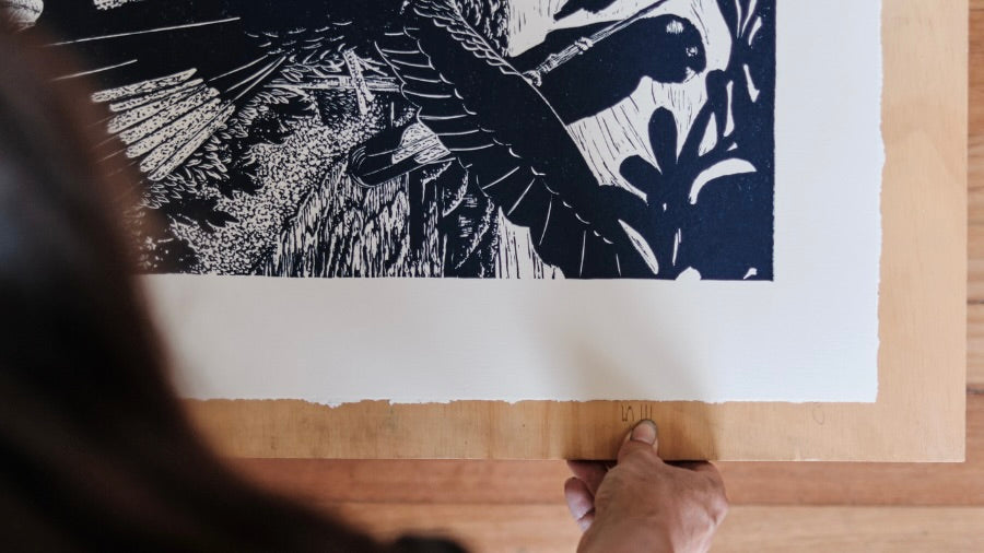 Peta West is a practicing contemporary Australian printmaker whose work taps into the sublimity of her surrounding environment on the South Coast of New South Wales. Working primarily with linoleum, West creates immersive large-scale prints that beguile audiences with their intricate detailing and depth. West’s prints are worlds unto their own, each a self-contained universe, where plants and animals appear in abundance. They are odes to the natural beauty and resilience of the Australian bush. West’s works are visual collages of her experiences throughout the year, marked by specific interactions with the surrounding flora and fauna.