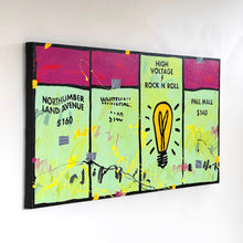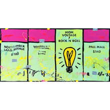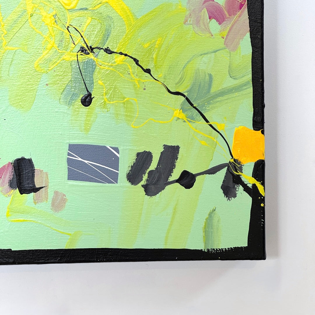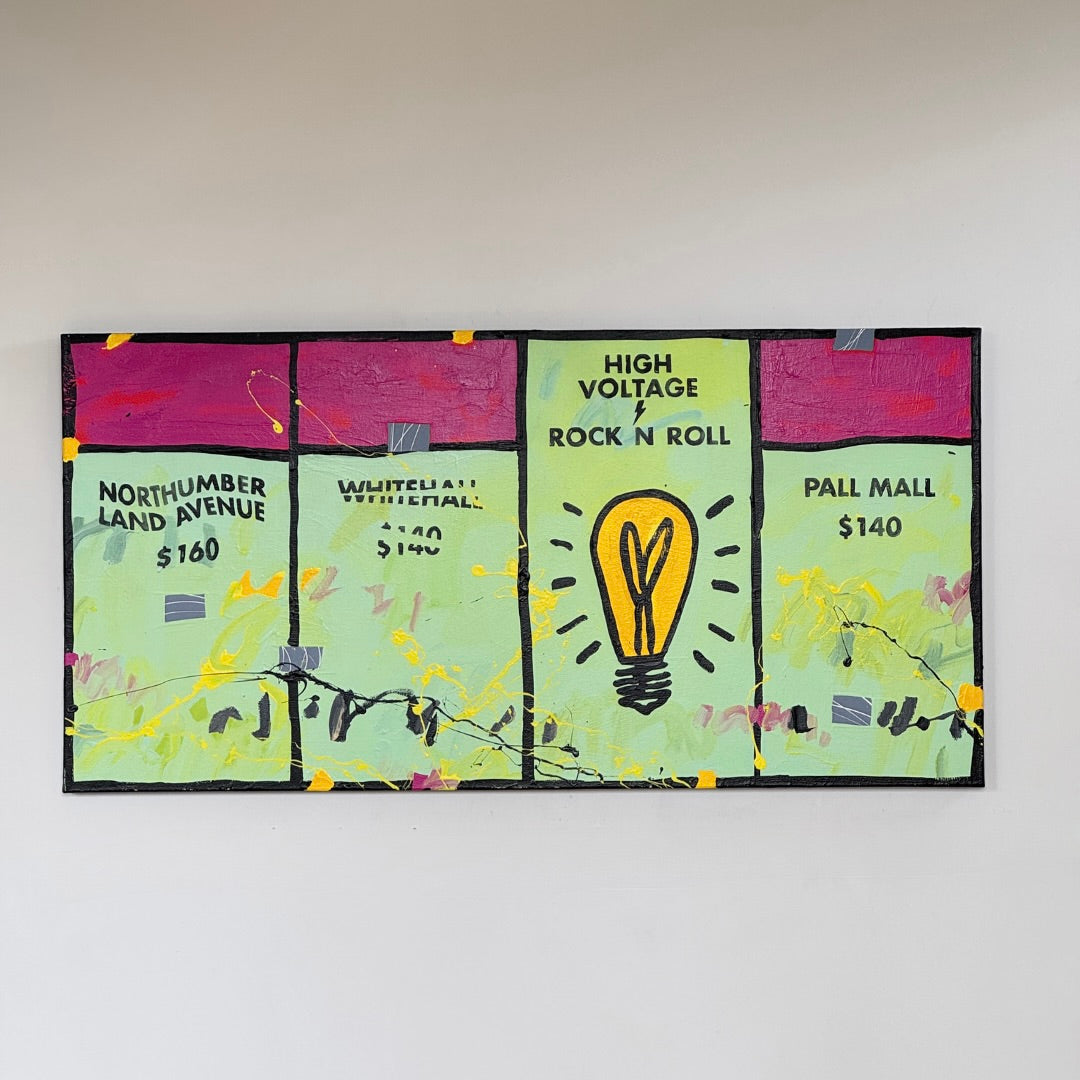 This original painting by Ben Tankard is created with artist-grade acrylic paints on canvas. The surface is richly textured, built up of multiple layers, with lumps and drips and spatters. The sides of the canvas are painted, and the painting is sealed beneath a glossy varnish. It is signed and titled on reverse.