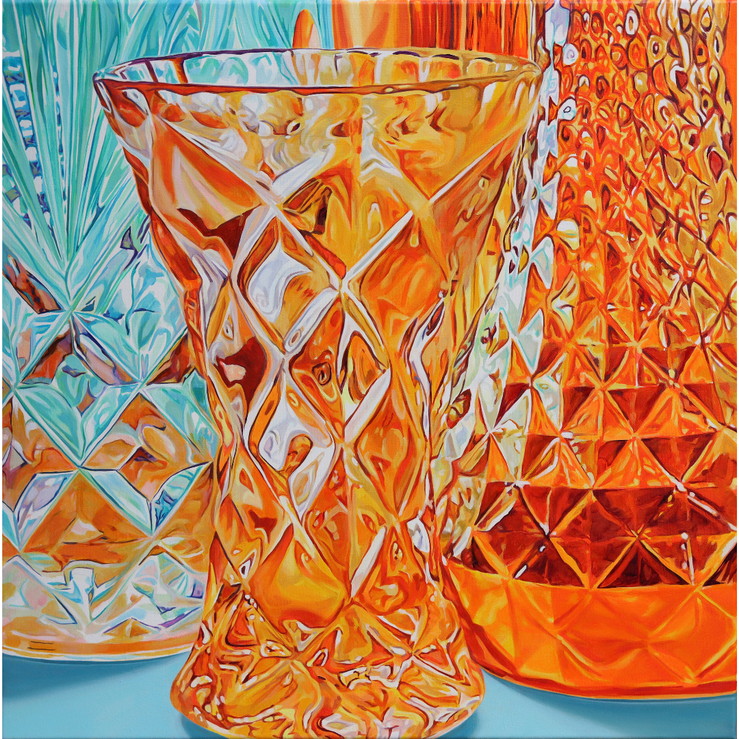 This original oil painting on canvas by Cathryn McEwen captures the play of light, transparency and imperfections in vintage glassware.