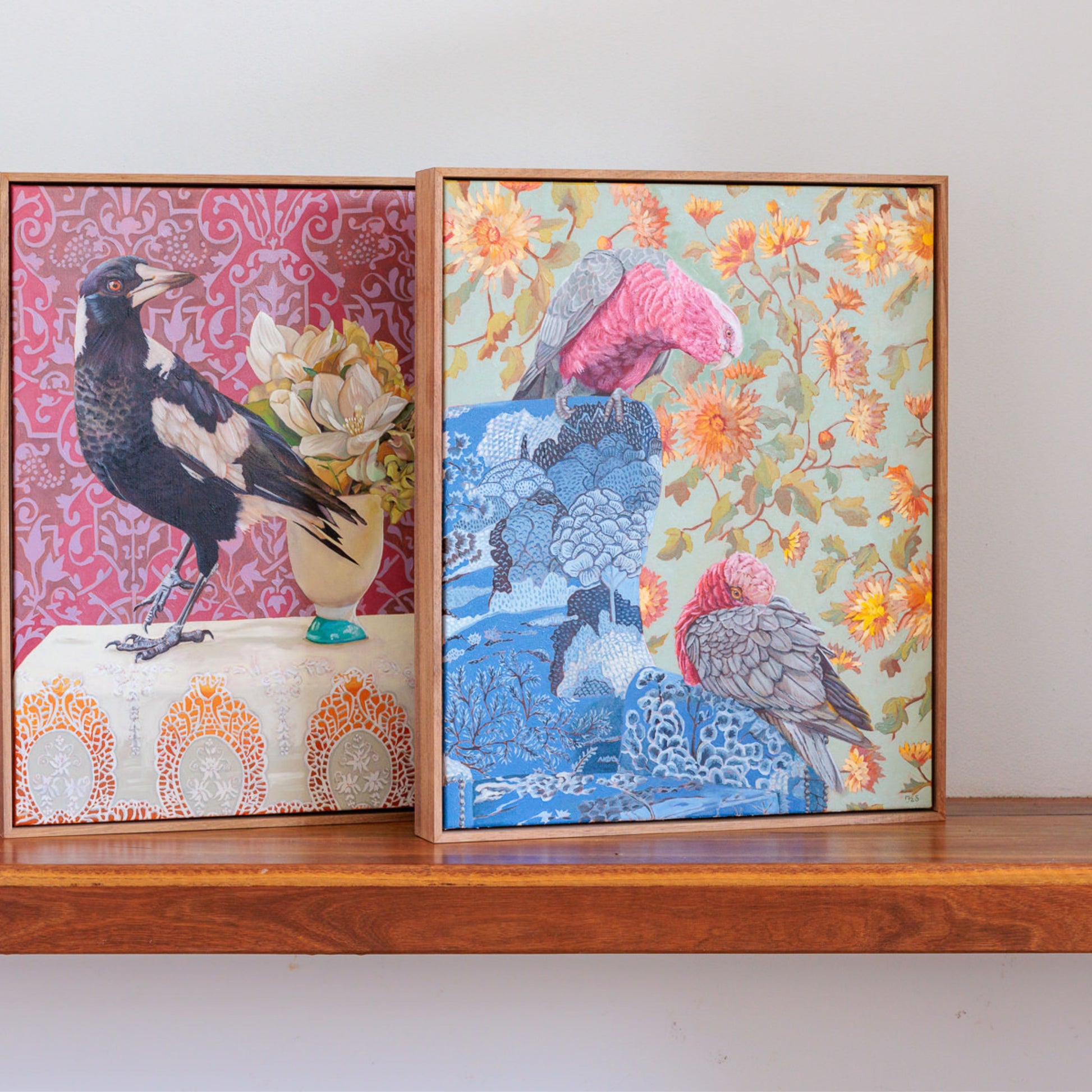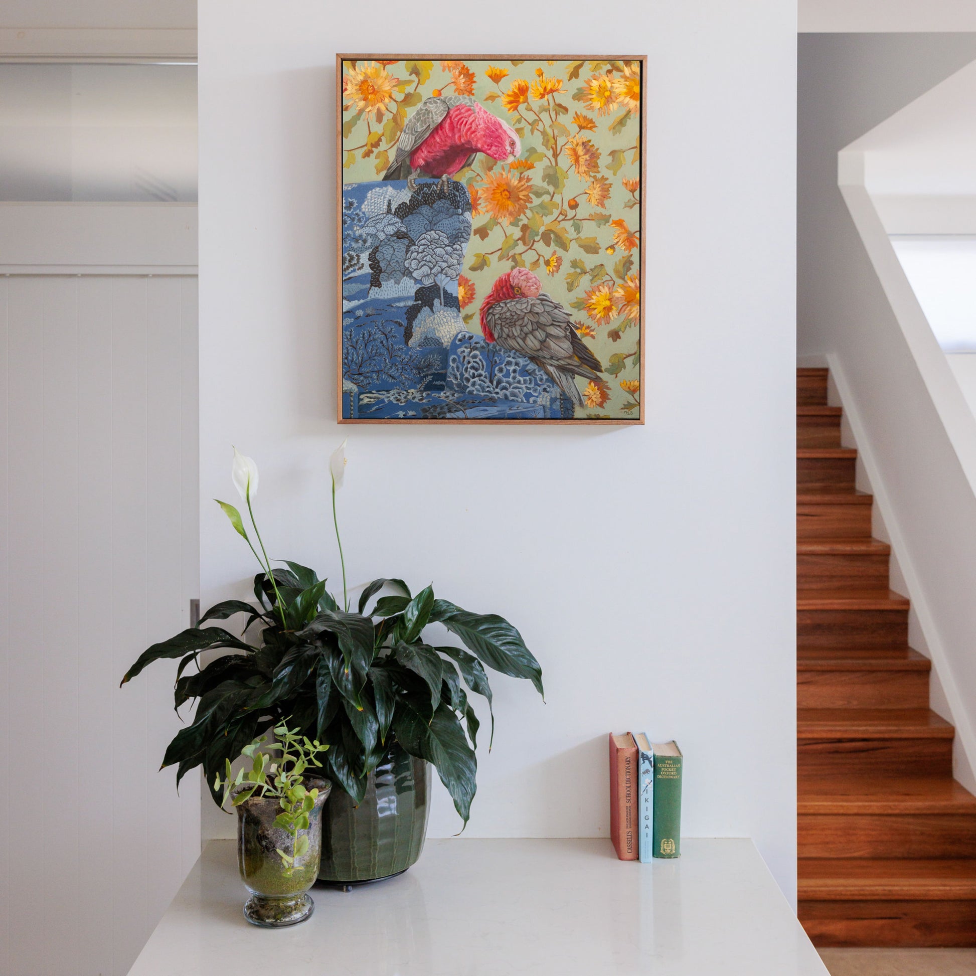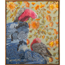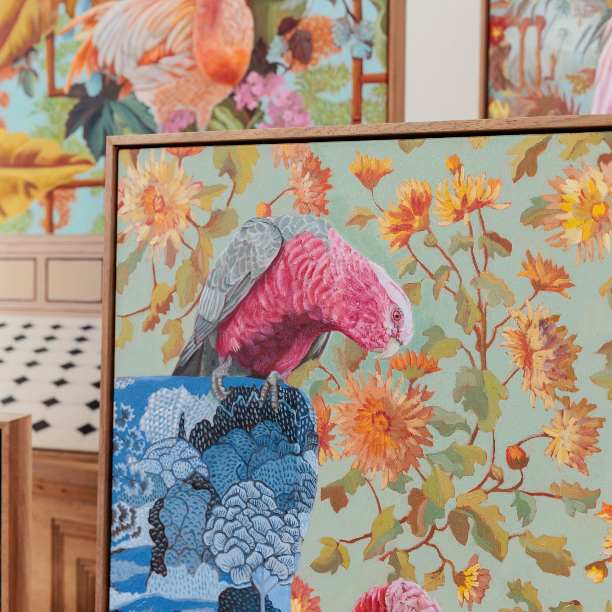 A female Galah watches over her sleepy mate on a Chinoiserie armchair. In the background is some wallpaper designed by Charlotte Horne Spiers in the late 19th Century in England.