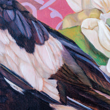 No collection ever feels complete without an appearance from one of Fiona Smith's friendly magpies. This one has landed on some French guipure lace. The wallpaper is based on a Henri II design by Lewis Foreman Day (1887).