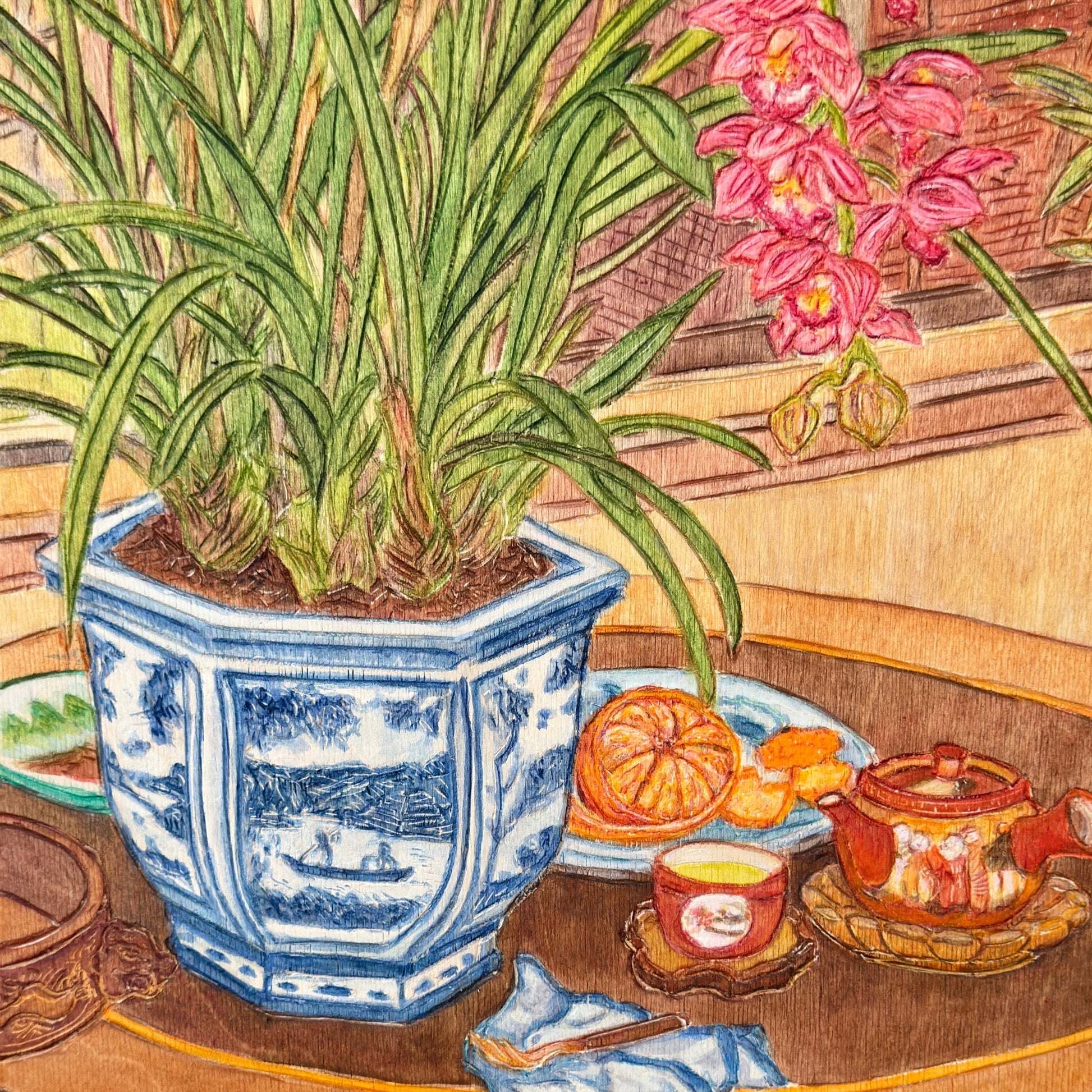 An original painting by Kean Onn See, carved and painted on woodblock panels. It comes wired and ready to hang.