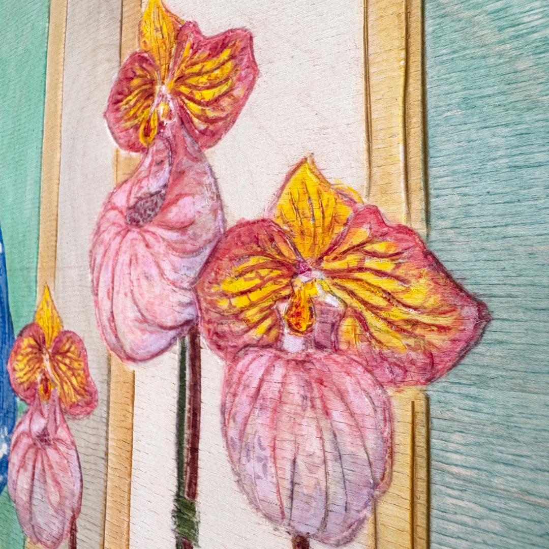 An original painting by Kean Onn See, carved and painted on woodblock panels. It comes wired and ready to hang.