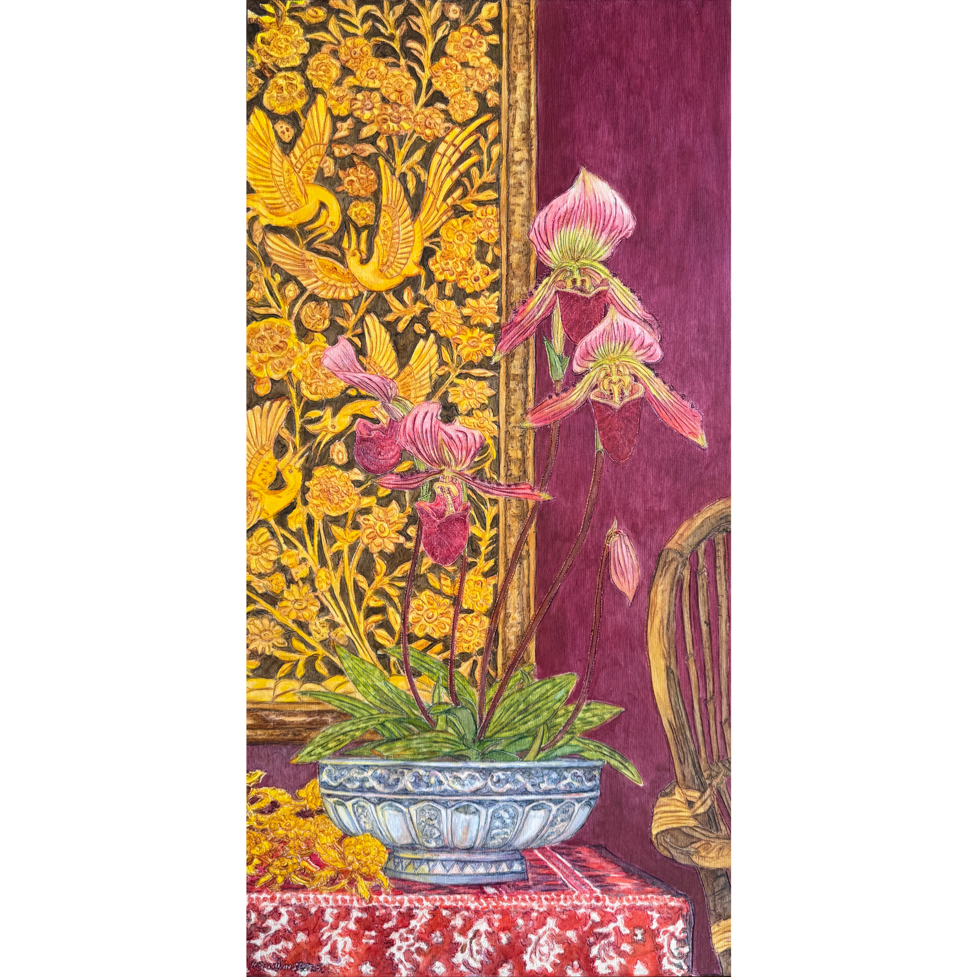 An original painting by Kean Onn See, carved and painted on woodblock panels. It comes wired and ready to hang.